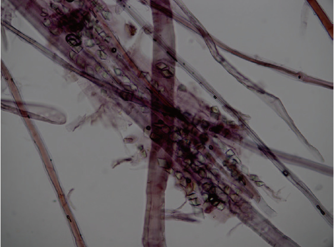 構(gòu)皮紙還有一個(gè)非常重要的特征是除纖維細(xì)胞外,紙張纖維中還能見到大量的草酸鈣晶體(如圖4),多呈菱形或者正方形,常存在于薄型細(xì)胞的腔內(nèi)或者細(xì)胞與細(xì)胞之間,造紙過程中的打漿和漂洗程序會(huì)使草酸鈣晶體流失,因而一些制作精細(xì)的構(gòu)皮紙中殘留的草酸鈣晶體相對(duì)少見。