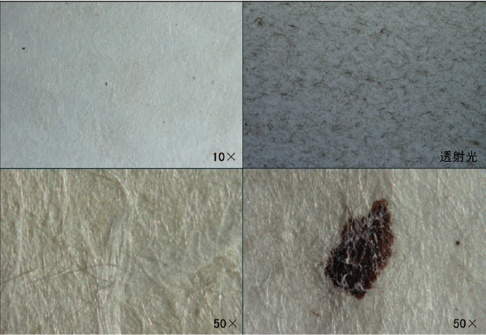 構(gòu)皮纖維雖不及麻纖維那么長(zhǎng),但遠(yuǎn)長(zhǎng)于竹纖維,一般在5-10mm 左右。由于構(gòu)皮本身具有一定的白度,纖維素含量也比較高,因此構(gòu)皮紙成紙白度一般要高于麻紙和竹紙,構(gòu)皮紙質(zhì)地較麻紙綿軟,韌性好,常被稱為“白棉紙”,亦有“蟬翼”、“冰肌”等雅喻。構(gòu)皮紙紙面的勻度和平滑度一般介于麻紙和竹紙之間,由于蒸煮過程中用到草木灰,構(gòu)皮紙一般潔白中略偏灰色,紙面纖維在光線照射下會(huì)泛出絲質(zhì)光澤。由于纖維較長(zhǎng)不易分散,成紙內(nèi)常見有未打散的纖維束,形態(tài)蜿蜒曲折,兩端多散開呈絮狀(如圖1 左下)。構(gòu)皮紙?jiān)诖娣乓欢螘r(shí)間之后,紙面常見有零星的淺銹黃色暈點(diǎn)狀氧化斑,曾有文人墨客因此雅稱其為“桃花紙”。另外,手工抄造的構(gòu)皮紙?jiān)诶w維間還常會(huì)殘留一些構(gòu)皮外皮的黑灰色碎屑,這也是構(gòu)皮紙的一個(gè)特征(如圖1 右下)。