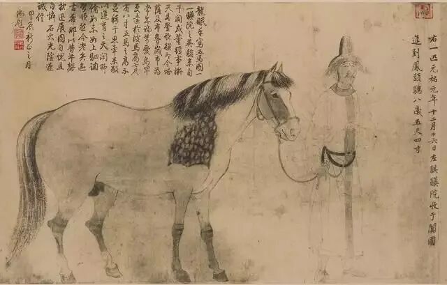 澄心堂紙不僅用于書法,也用于繪畫。據(jù)記載北宋畫家李公麟作畫不喜歡設(shè)色,多用白描,用的也是澄心堂紙。根據(jù)明代大收藏家項(xiàng)元汴考證,李公麟的傳世名作《五馬圖》用的就是澄心堂紙。